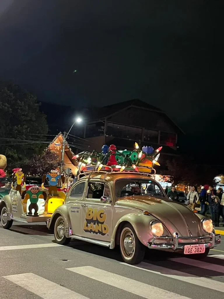 Foi ali que o fusca do Parque Big Land ganhou destaque. O veículo colorido, que começou participando da “paradinha” ao lado de carros de outros atrativos, tornou-se presença esperada nas celebrações de Canela. Desde então, assumiu funções especiais: já foi o carro oficial das soberanas da Festa Colonial e também do Sr. Coelho na Páscoa de Canela. Nesta edição do Sonho de Natal, o fusca da Big Land vive mais um momento marcante, já que é oficialmente o carro do Papai Noel nos cortejos diurnos e nas pardinhas noturnas também está presente, reforçando o papel do parque como parceiro ativo na cultura, no turismo e na vida comunitária da cidade.